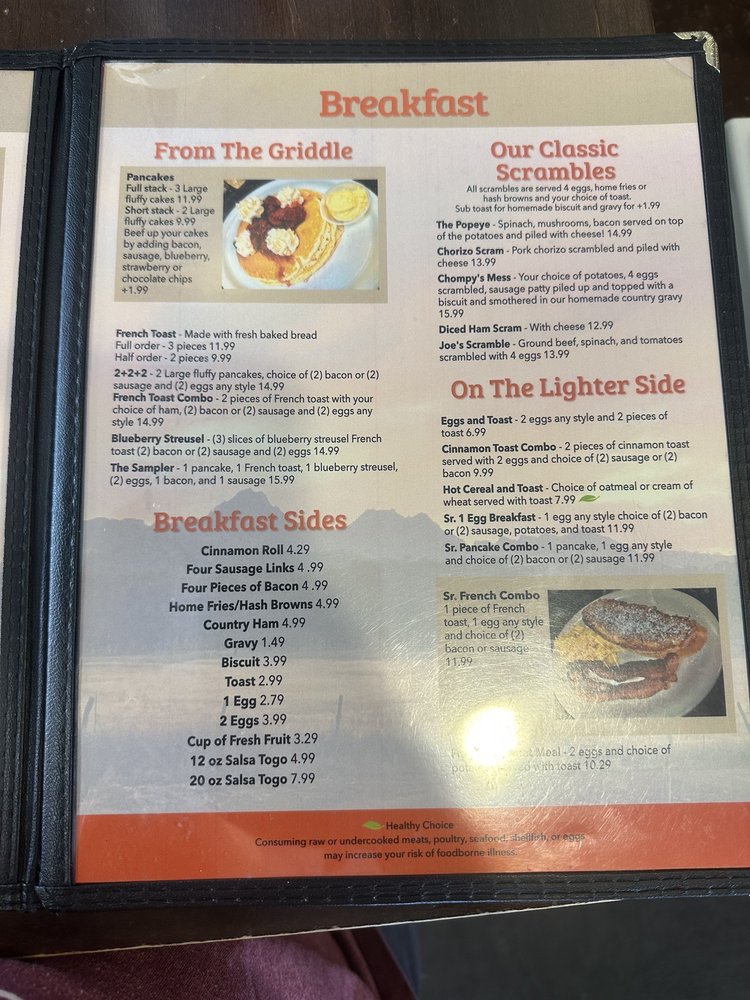 A Huge slab of Country Ham - Eggs any style - your choice of side and toast or upgrade to biscuit and gravy or a pancake